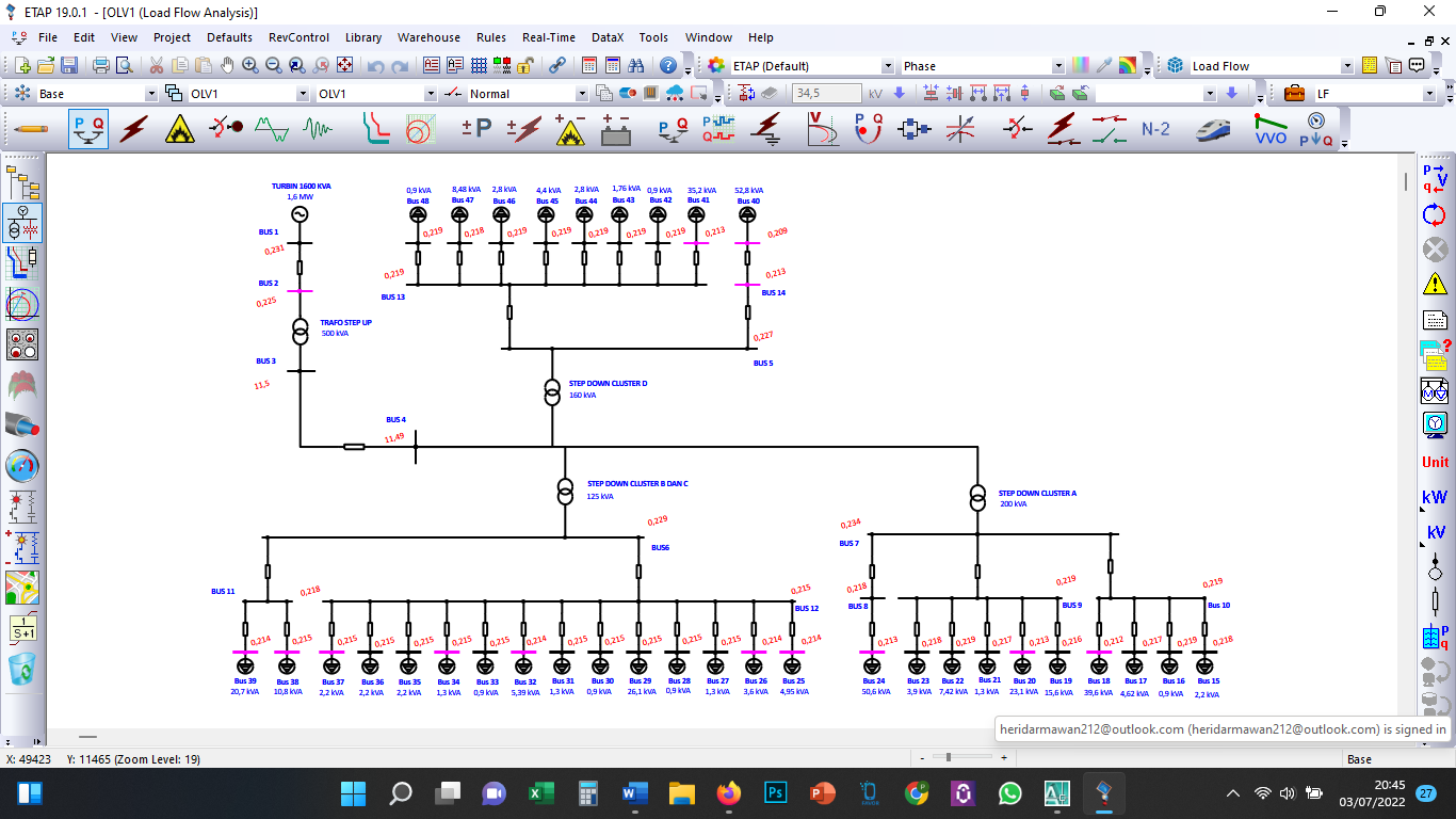 - Dilakukan analisis aliran daya dengan ETAP dimana jatuh tegangan yang terjadi pada keseluruhan bus beban, berkisar antara 0,3 sampai 4,7 % atau 0,379 kV sampai 0,362 kV. Nilai tersebut masih dalam standar tegangan yang di ijinkan untuk jaringan tegangan rendah (JTR) variasinya adalah maksimal + 5 % dan minimal -10 % terhadap tegangan nominal (SPLN1 : 1995).